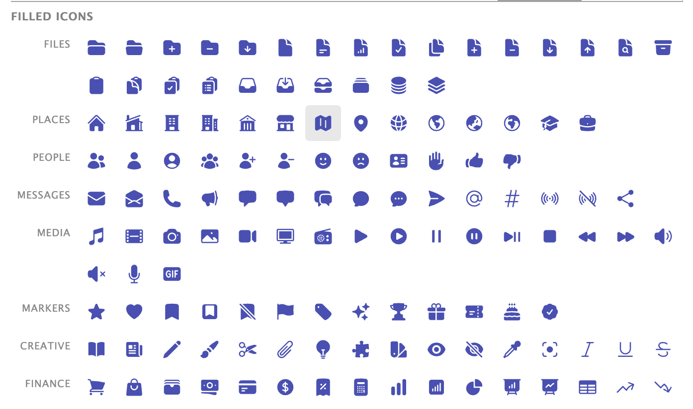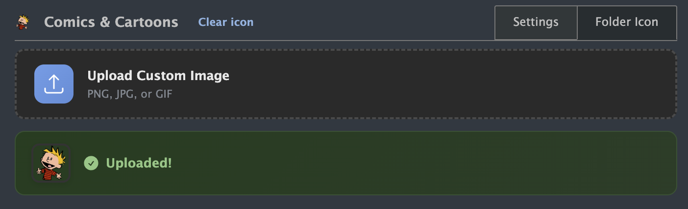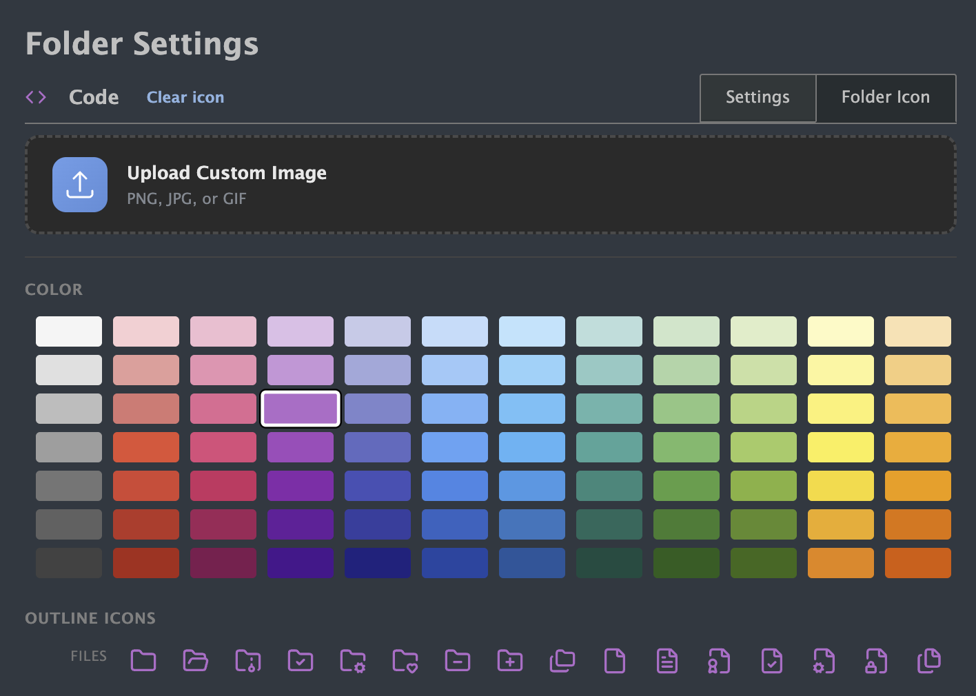 Preset icons: Pick from over 240 icons (a mix of outline and filled styles) and colorize them with any of 84 colors organized by hue. Want a red heart for your favorites folder? A blue code bracket for programming feeds? It’s all there.